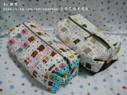 這二個在作的過程中,最難得是在已車縫好的拉鍊部份壓線。調慢車縫的速度,慢慢地、慢慢地壓線,推布。