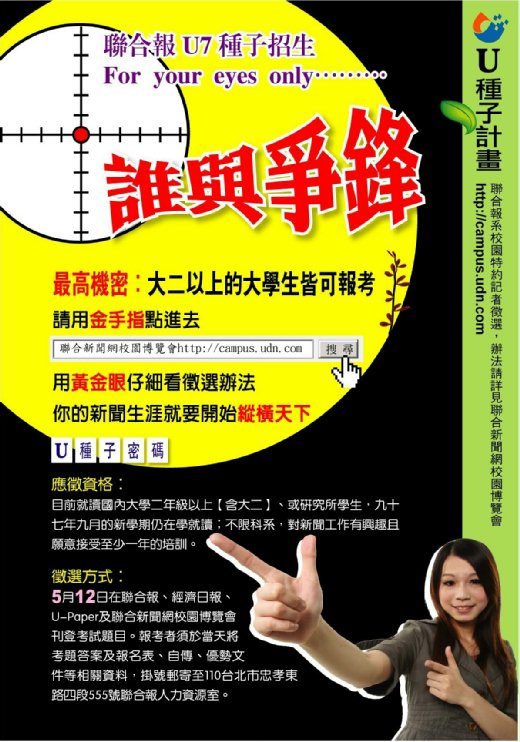 提醒:U種子徵選試題,將於5月12日公布,敬請留意! 年輕,是希望,也是力量。聯合報系看到了年輕的希望,更要借重年輕的力量。過去六年,聯合報系推動國內首創的校園特約記者(U種子)制度,獲得各界熱烈迴響,並已成為國內媒體培育年輕新聞工作者的標竿,上百個種子已開花結果。 今年,新的U種子正要萌芽,您的加入將是個人生涯規劃的美好起步,也是聯合報系的榮耀。 【應徵資格】 目前就讀國內大學二年級以上(含大二)、或研究所學生,且九十七年九月的新學期仍在學就讀;不限科系,對新聞工作有興趣且願意接受至少一年的培訓。 【徵選方式】 徵選將分兩階段進行。 .第一階段初試:主辦單位將在5月12日在聯合報、經濟日報、U-Paper及聯合新聞網校園博覽會(http://campus.udn.com)刊登考試題目或連結網站(聯合新聞網校園博覽會公佈時間是00:07am)。報考者依規定完成作答,試卷連同報名表、自傳、優勢文件(請製作清單,若有影音作品請附光碟)等資料,須在當天(郵戳為憑)掛號郵寄或送達110台北市忠孝東路四段五五五號聯合報系人力資源室收。信封上請註明「應徵校園特約記者」。 .第二階段複試:預計在6月27日。通過初試者另行通知。 【錄取名額】 正取30名,備取若干名。 【報到日期】 八月一日報到,隨即開始暑期實習,未報到者視同放棄。 【權利與義務】 .錄取者需參加共六週的寒、暑期實習及相關訓練課程,實習期間可支領交通津貼,另有意外保險等福利。 .除實習期間有專人指導外,本報系另請資深優秀記者,負責全年的輔導及諮詢。 .實習報到日起為期一年,U種子可用本報系校園特約記者的名義,參與本報系報紙及網路媒體的校園新聞採訪撰稿,稿酬從優,特殊表現另有獎勵。 .培訓一年期滿,已畢業可進入職場者,經本報系評定表現優良,通過面試後,可進入本報系任職。 想知道更詳細的,請見校園博覽會。 http://mag.udn.com/mag/campus/index.jsp |