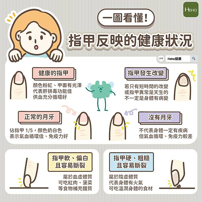 一圖看懂!指甲反映的健康狀況從指甲也能看出健康狀況嗎? 就中醫觀點來看,筋為肝所主,是肝的精氣所生, 說明爪的營養來源和筋相同。 所以,肝與筋的虛實情況,可以從指甲的變化反映出來。 凡筋力健壯者,爪甲多堅韌; 筋衰無力者,爪甲多薄而軟。因此,只要時常注意指甲上的微妙變化,就可探查身體健康狀況。 指甲反映的健康狀況ㄧ、健康的指甲 健康的指甲,應是顏色粉紅、甲面有光澤,代表肝排毒功能佳、供血充分循環好;若肝血不足,則指甲色澤枯槁、蒼白,則可能有貧血的跡象。 二、指甲發生變化 如果手上的多個指甲突然有了明顯改變,或某種指甲異常長期存在,就需要注意預防相關的疾病。像是消化系統出現問題,甲床的營養供應減少、易使指甲生長緩慢;或代謝不佳、廢物排出受阻,使得指甲失去透明感,變得污濁粗糙。但若只有短時間的改變,或指甲異常是與生俱來的,則不一定是身體有病變。 三、正常的指甲月牙 指甲上的月牙與腎氣的強弱、生殖系統健康有關。正常的月牙佔指甲 1/5,顏色為奶白色、形狀明顯。面積從拇指、食指、中指等依次遞減。月牙多表示氣血循環佳、免疫力及生育能力也較好。 四、指甲沒有月牙 如果沒有月牙,並不代表身體一定有疾病,但表示身體的氣血循環較差,免疫力及生育能力也會比較差。 指甲易斷裂跟體質相關中醫認為,指甲易斷裂的主要原因為營養不均衡,代表有血虛、陰虛等問題,這可從指甲的軟硬度來看。