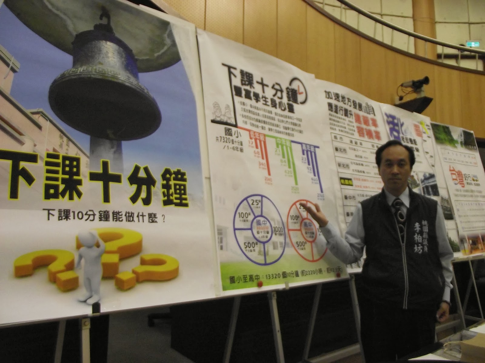 【傾聽民意 為民發聲】下課10分鐘能做什麼? ( 下課10分鐘能做什麼?每天善用每一節10分鐘的下課時間,透過有效的時間管理,可以在時間的共鳴與潛移默化中,豐富學生的身心靈。桃園縣政府教育局認為善用下課10分鐘是可行的,研議後將推動實施。 下課10分鐘除了可強化品德教育外,也可以透過語言的複習,讓學生能從小紮根,於將來個人事業之規畫,奠定迅速與國際接軌的基礎。目前,桃園縣國小、國中與高中每周上課期間,扣除午睡與環境清掃,每周有17-25個10分鐘:國小低年級:17個/周。國小中年級:21個/周。國小高年級:23個/周。國中、高中:25個/周。以國中為例,每周有25個10分鐘,一學期20周有500個10分鐘,亦即5000分鐘,約83.4小時,如妥善規劃利用,每位國中與高中學生,三年下來,有3萬分鐘,500小時可以充分利用。從國小至高中,有13320個10分鐘,亦即133200分鐘,2220個小時,約92.5天。 依國小、國中與高中不同年齡層,播放音樂或教導每日一字或英文或台灣俚語或偉人名言或敬師語,或由學生們分享讀書心得;可以各校的自治市(鄉鎮)長團隊或班級為單位,鼓勵學生製作10分鐘的內容,由學校統一播放,讓學生透過參與而學習成長。 |