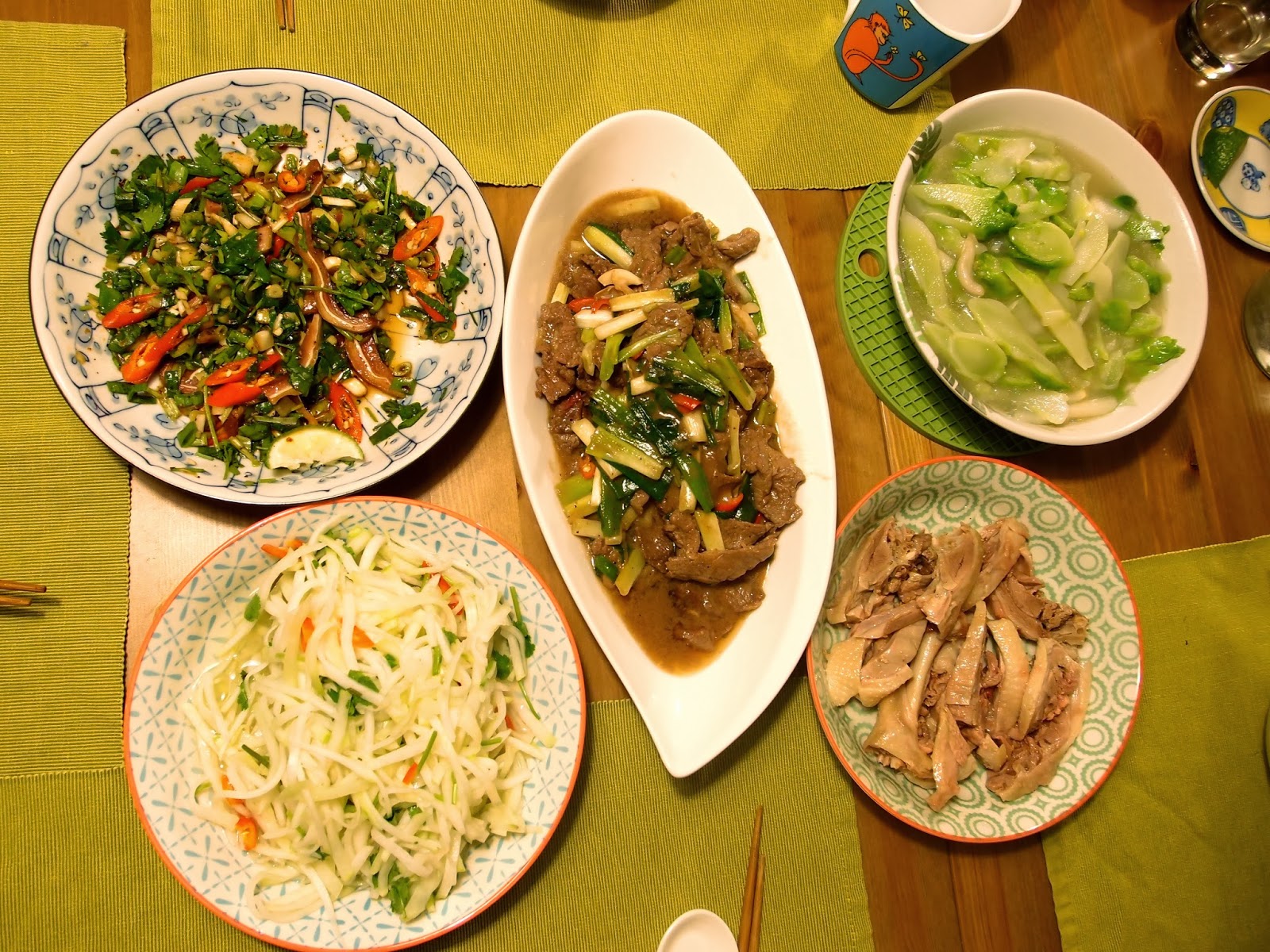 因為做甜點的關係,晚上就吃快炒還有涼拌。蔥爆牛肉又快又方便。737菜市場的阿伯鵝肉好好吃。燻豬耳朵也是,有肉汁,又QQ的。芥菜的娃娃菜切片快炒,跟雞湯一起煮。本來以為煮太多,竟然完食。
