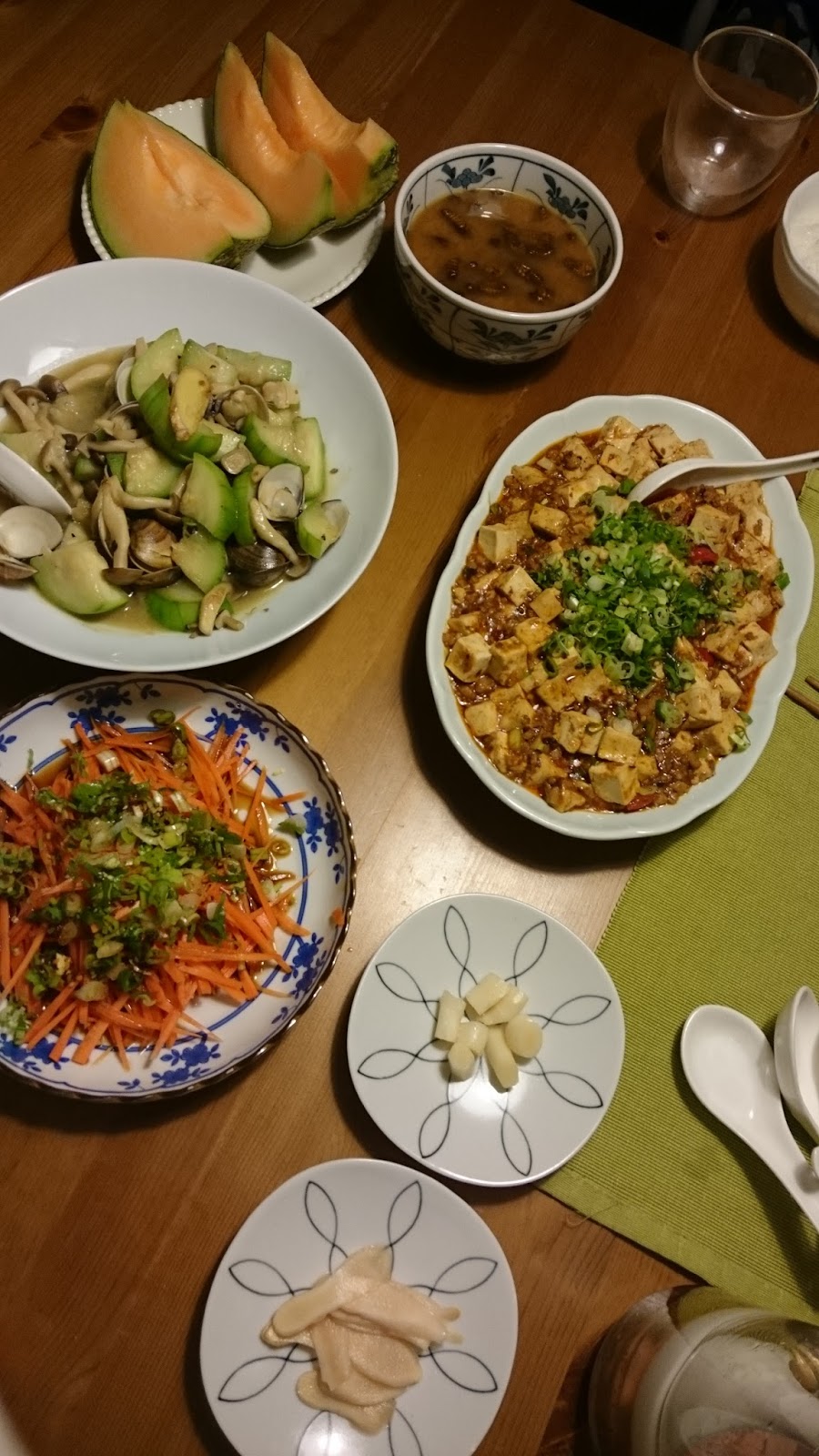 週日下午作布丁,晚上就吃我煮的麻婆豆腐,涼拌胡蘿蔔,與絲瓜蛤蜊炒鴻喜菇。
