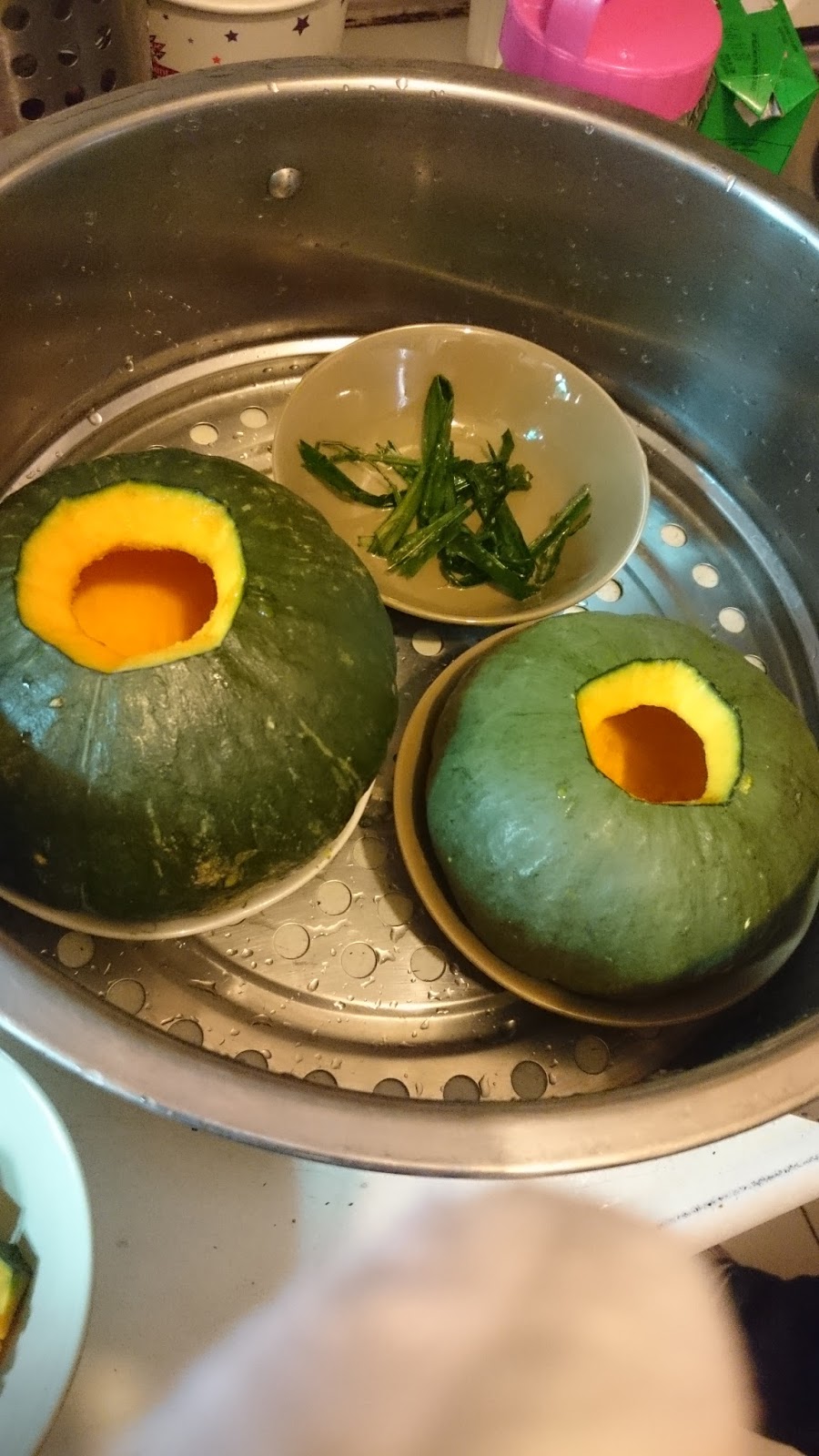 南瓜放在小碗上(感謝朋友,這很重要),小碗裡頭可以放剛才剩下的香蘭葉,不用丟,蒸完再丟。把南瓜內部灌入蛋液,之後放在水滾的蒸籠裡,好好蒸上45-50分鐘。不用蓋鋁箔。