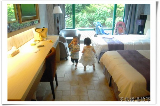 七月底,正值炎炎夏日,敝家族16口人(爺爺奶奶、大伯一家四口,以及二伯與三伯家各三口,加上我們家四口)各自朝新竹前進。由於這是蝦兔第一次外宿,行前一晚還在整理他們的行李,搞到半夜2點多才入睡,就怕少帶小朋友生活必需品。 早上六點,叫醒蝦兔,泡牛奶換尿布等排便,再次確認行李,做好行前準備,八點半上車,先到關西休息站和大家會合。一路上晴空萬里,蝦兔安靜地瞪大眼睛坐在安全座椅上凝望窗外,彷彿感覺到這次行程和往常的出遊不太一樣。路上車輛不算多,行車速度正常,不到一小時就到集合地(實在很怕塞車會讓蝦兔坐不住而在車上鬼叫)。當蝦兔一進到休息站,爺爺、奶奶,以及眾家伯伯、伯母、堂哥、堂姊們一擁而上,爭相要抱蝦兔,簡直像是巨星蒞臨被眾粉絲包圍,兩人也歡喜地笑咪咪。 我們稍做休息並討論行程和路線,接著朝午餐地點峇里森林溫泉會館出發。天氣溫熱又太早起床,蝦回車上不久就昏昏欲睡,兔則一路和媽媽聊天,快到午餐地點才支撐不住睡著,只是車一停好,熱情親人們的聲響又將她驚醒。 大家先在園區四處逛逛,中午在古代魚餐廳吃飯。蝦似乎心情特別好,不僅胃口大開,也不懼怕眾粉絲的抱抱,兔則一反常態老是黏著小公主或我,連吃飯也不太起勁,看來真的是熱昏了。大夥簡單用完餐點後,驅車前往內灣老街逛逛,蝦兔在此獲得人生第一個風車(不過蝦的風車三天後就被他折斷了)。 豔陽高照,我們這一家有老有小,不宜長時間戶外行動,於是大家浩浩蕩蕩朝馬武督統一度假村前進。蝦上車不久照樣流著汗睡著了,兔鬧了一會脾氣,哼哼唧唧地靠著媽媽睡,看來這七月的驕陽真讓蝦兔受不了,汗流了又乾,乾了再流,小臉曬得紅通通的,唉呀,爸媽心疼啊。 大約半小時的短暫山路,總算來到度假村了,大夥趕緊各自回房放行李。房間擺設簡單雅緻,光線明亮,說是兩張小床的雙人房,但這單人床卻很大,併在一塊後,睡我們一家四口沒問題。蝦兔一進房就四處跑去巡邏,大概覺得很新奇,小公主則照慣例拍照證明到此一宿,不一會爺爺奶奶按鈴進來帶走蝦兔,我們稍加收拾就先和大家一起去喝附贈的下午茶。 出乎意料的是,下午茶很簡單,每人兩片手工餅乾一片蛋糕,茶包和咖啡及汽水類的飲料則無限供應。大家吃喝點心後,決定馬上開始玩,二伯選定先去滑草。 一開始,蝦兔看哥哥姊姊們滑草也看得呵呵笑,突然間蝦被二伯抱去滑草,可能來不及反應,蝦看起挺鎮定,我就抱蝦再滑一次,怎知蝦一路哭到底。而兔一看此景,採取大哭抵抗堅持不滑草,二伯硬帶著滑一次後,她更是生氣地哭著跑去找媽媽。等大家滑過草後,就一起在園區逛逛,兔開心地跟小公主與三伯母騎了空中踏踏樂,蝦則在月台揮手傻笑,要讓他去坐也抵死不從,真是搞怪的兄妹。 就這樣邊逛邊玩邊拍照,園區裡有新建好的OPEN將渡假別墅,蝦兔當然也在途中的歐洲莊園與日式和風別墅前留影。看到蝦兔的臉龐被曬得紅通通,可愛極了,超像蘋果喔。 回到渡假大樓,先到二樓兒童遊戲區,蝦兔一看到滿坑滿谷的球池,完全放開胸懷玩起來,一會鑽入球海中,一會爬到斜板上再溜滑梯下來,來來回回奔竄不停,完全將在太陽底下的疲態拋諸腦後,彷彿精力無限,此刻應是他們這天行程中感到最愉快的時候,深覺那球球世界才是他們倆的天堂。 看到其他人有的去室內泳池有的去健身房,我們也帶蝦兔回房去換泳衣,結果一進泳池,兔就跟在自家社區泳池一樣嚎啕大哭,蝦也跟著哭起來,無論大人如何安撫都停不下來,最後只好草草結束,先返房間休息與梳洗,等待吃晚餐。 晚餐吃的是合菜,菜色相當豐富,口味不錯,最後還有西米露和水果。蝦兔吃飽喝足,四處走來走去,其他人去視聽室看電影了,他們兩個只看五分鐘就往外跑,好吧,回房洗澡睡覺。經過這一天的折騰,蝦兔身心又興奮又疲憊,這也難怪,被大太陽熱吻一天,加上長輩及兄姊們的熱情以對,也真夠他們受的。 換上小睡衣後,一向睡自己小床的蝦兔有點不知所措,我和小公主努力安撫後,這一晚蝦兔很好入眠,雖有掙扎但還算順利,九點多兩個小傢伙都入睡了。不過睡我旁邊的蝦,還是不改本性,邊睡邊360度亂轉,我心想睡得飽就好,管他睡相如何,也跟著睡了。 清晨四點,蝦忽地站起身來叫醒爸媽,兒子呀,爸爸開了一天的車,好累呢。好不容易再把蝦哄到睡著,小瞇到六點,索性獨自起身到外頭走走,拍了幾張早晨的照片,接者回房梳洗,和小公主帶蝦兔下樓吃自助早餐。 經過一夜好眠(兔居然一覺睡到七點),蝦兔食欲頗佳。餐後哥哥姊姊去玩過關遊戲拿獎品,蝦兔去射箭場看爸爸和哥哥射箭,途中在OPEN將美西牛仔與地中海別墅(小公主一直吵著要住這間)前留影。呵呵,可能是太陽太大,小傢伙臉都臭臭的,不愛戴帽的兔也自己捉著圓帽盤遮陽。趕緊再推回大樓,哥哥姊姊忙著DIY童玩,蝦兔則傻傻地被二伯餵了辣蝦味先。 十一點辦完退房,領了伴手禮黑糖糕,哥哥姊姊們還要我們去選玩偶,原來每位小朋友過完五個關卡就送一隻OPEN將玩偶。挖哩勒,不早說,虧我一早散步回來就先買了。於是乎,蝦兔每人領有兩隻娃娃,也不錯啦。 午餐三伯提議去關西70年老店吃客家菜,中午太陽十分強悍,大家看起來都沒啥胃口,蝦兔也無法專心吃飯,根本坐不住。簡單用完餐後,頂著大太陽站在馬路邊商量一會,決定轉去石門水庫附近的湖水岸香草花園喝下午茶。 在舒適涼爽的冷氣