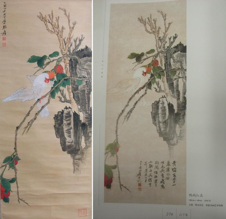 Red-beak White Parrot Flower Bird Tree and Rock Painting by Zhang Daqian dated 1935, vs. Parrot and Red Litchi by Zhang Daqian dated 1940 (H 103 x W 40 cm, Ink and color on paper, Hanging Scroll, dated Oct. 1940, 《Painting Collections by Zhang Daqian, Volume 2, Page 278》published by Beijing Craft and Art Publishing Company, Collected in Hong Kong Painting and Calligraphy Art Museum.)