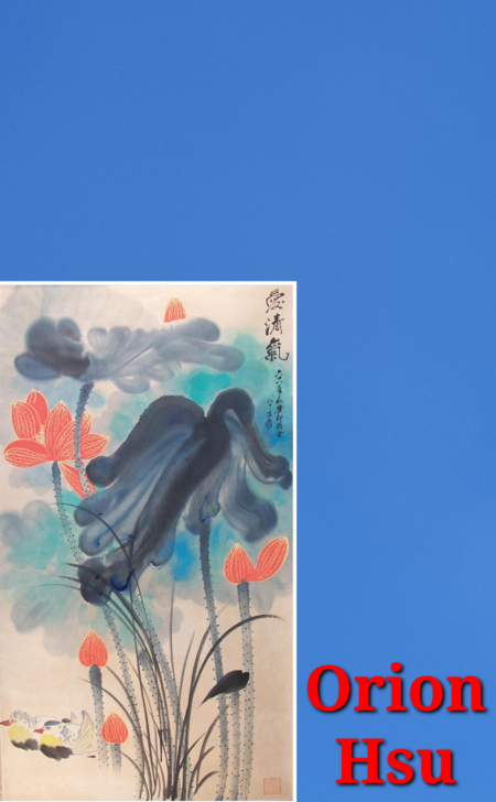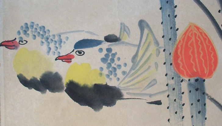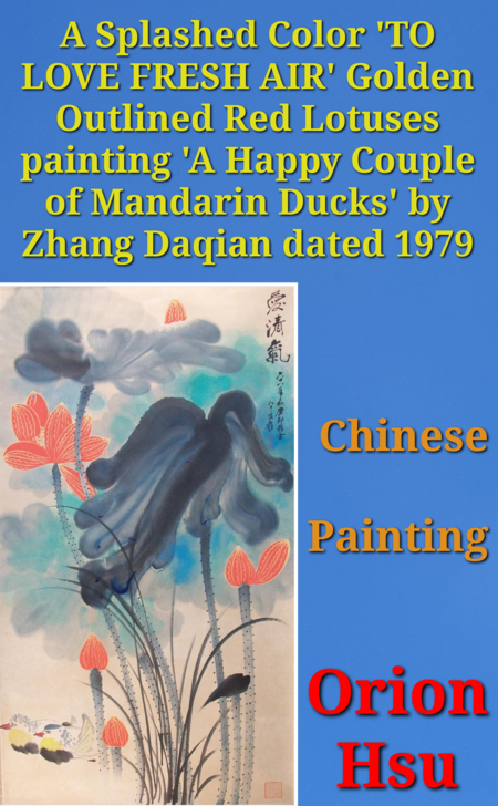 A Splashed Color TO LOVE FRESH AIR Golden Outlined Red Lotuses painting A Happy Couple of Mandarin Ducks by Zhang Daqian dated 1979