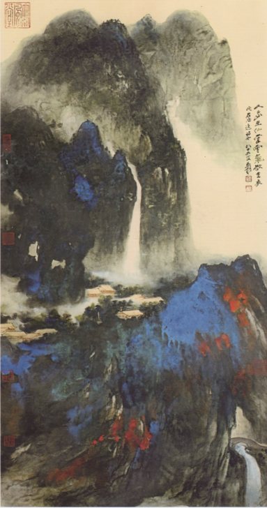 The Heavenly Place in Mankind World by Zhang Daqian dated 1982. 張大千1982年作"人家在仙堂潑彩山水圖"H177xW94cm直幅設色紙本鏡片 題識:人家在仙掌,雲氣欲生衣.此右丞逸詩也.八十四叟爰. Splashed ink and colour on paper,mounted,signed 84 YEARS OLD MAN YUAN,inscribed PEOPLE LIVE IN THE HEAVENLY PLACE,THE HEAVY CLOUD IS TO BECOME THEIR CLOTHES.THIS IS THE POEM WRITTEN BY WANG WEI,with 8 seals of the artist. The sister painting "Hermit" dated 1966 H193xW101cm was sold USD1,685,900 in Beijing Poly 6/3/2010 Lot.2676;sold USD5,558,400 in Beijing Googut 6/3/2011 Lot.60. Origin: The family member of the Kuomintang party high ranking founding official(國民黨黨國元老家族藏品)who received from the artist directly! Authenticity: The handwritings and signature of Zhang Daqian in this are the same as those 21 words in "Houses on a Mountain" by Zhang Daqian dated 1982 H70xW33.8cm,sold USD282,700 Christie’s Hong Kong 2011 Spring Auction Lot.2627 5/31/2011,"Paintings of Zhang Daqian,Vol.5",P101,Pic.59,Museum of History,Taipei,Taiwan 1983. 本名畫之題識中 "人家在仙掌,雲氣欲生衣.此右丞逸詩也.八十四叟爰." 21個文字,與台灣台北歷史博物館1983年10月初版 "張大千書畫集第五集" 第101頁圖版59 "仙掌人家"(H70 x W33.8 cm 1982年作) 之題識21文字 "完全相同". "仙掌人家 Houses on a Mountain" 圖於2011年5月31日在佳士得香港有限公司2011年春拍 Lot.2627 售出 USD 282,700元. 而此21個文字, 於兩幅畫中筆跡完全相同, 確係皆為張大千本人之親筆書寫筆跡無誤. 且此兩幅名畫之題識簽名內容, 不論是字與字的連貫, 行與行的呼應, 或是張大千本人之信筆落款畫紙, 隨手寫來, 間中停筆, 偶因墨枯再醮墨, 墨色停頓起始, 黑灰濃枯, 筆墨乾濕濃淡, 皆有所變化, 然看起來卻是如前後一氣呵成, 並非臨摹之仿筆, 足以證明, 此兩幅名畫皆為張大千本人的真跡原作. 此幅名畫為張大千大師開創於晚期的 "細潑細筆式潑彩" 畫法, 雖然有些仍是以中國國畫之 "工筆、寫意、鉤勒、設色、水墨等技法形式" 為輔, 但卻已經 "惜筆如金". 畫紙上的絕大部分作畫內容, 都是以 "潑彩" 畫法細潑細筆以成之. 這種畫法之困難度極高, 因為畫家必須控制 "潑彩渲染度" 就如同手握 "細筆" 一般, 不論是色彩之調合度與筆意, 皆必須是 "意到即筆到(潑到)" 般恰到好處, 絲毫不容許有任何差錯, 連作畫用紙之渲染度亦必須拿捏精準, 完全無法 "既然粗略潑之, 即大概以成之.". 因為此種畫法相當耗時又耗工, 沒有數十年的 "潑墨" 及 "潑彩" 畫功及足夠經驗, 他人根本就是無法臨摹仿潑之, 否則只是糟蹋浪費自己的畫紙與昂貴顏料而已. 因此成品並不多, 見世作品也不多, 因為張大千大師都是以此種畫作成品贈送予國民黨黨國元老們欣賞居多, 而被鎖入深宮. 此幅名畫之另一幅姐妹作品張大千1966年作 "山居圖 Hermit Landscape" (H193 x W101 cm 鏡心直幅設色紙本 著錄: 1967年香港東方學會出版 "張大千畫集" 第128頁圖, 拍賣紀錄為: (1) 2010-06-03 北京保利國際拍賣有限公司2011年的5周年春季春賣會 "中國近現代、當代書畫夜場及北堂舊藏齊白石篆刻稀珍(二)" Lot. 2676 拍賣成交價: USD 1,685,900 元. (2) 2011-06-03 北京歌德拍賣有限公司2011年春季藝術品拍賣會 "藝海求真 - 中國近現代書畫專場" Lot. 0060 拍賣成交價: USD 5,558,400 元.