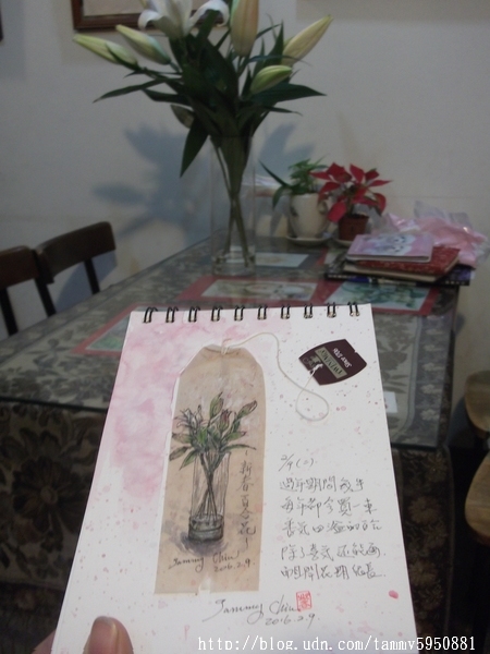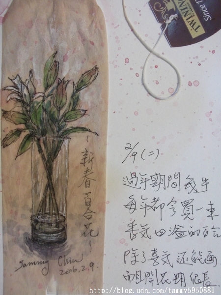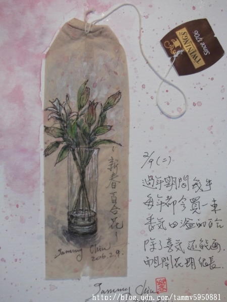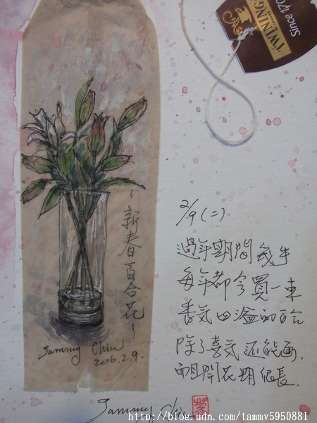 小蓉 / 繪圖攝影:【2016 / 043 淡彩茶包畫:過年瓶中花。百合】 2/9年初二吃完簡單中餐, 連續畫了3個茶包畫。 前2日弟妹來家喝茶,這些空茶包正好派上用場。 小蓉 / 繪圖攝影:【2016 / 043 淡彩茶包畫:過年瓶中花。百合】 第3個茶包撕開後,速寫年前買的百合花。 除夕傍晚,在黃昏市場邊的花攤買花回家, 先生一見我拿花進屋便問: 現在百合花很貴啊!買花幹嘛? 我說:還好吧,400元一把又不是經常買, 過年能賞心悅目花期很長,還可以畫下來很划算。 小蓉 / 繪圖攝影:【2016 / 043 淡彩茶包畫:過年瓶中花。百合】 百合,幾乎是花種裡面我最喜歡的了, 花期將近2個星期之外, 開花時,屋裡會飄散出淡雅花香, 讓人有好心情吧。 小蓉 / 繪圖攝影:【2016 / 043 淡彩茶包畫:過年瓶中花。百合】 |