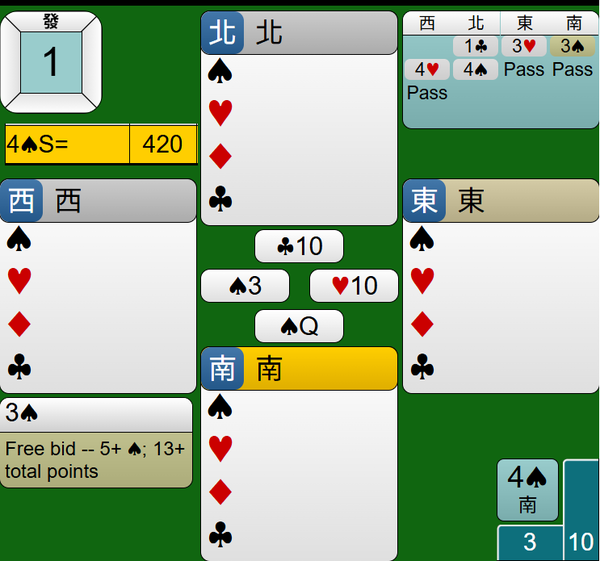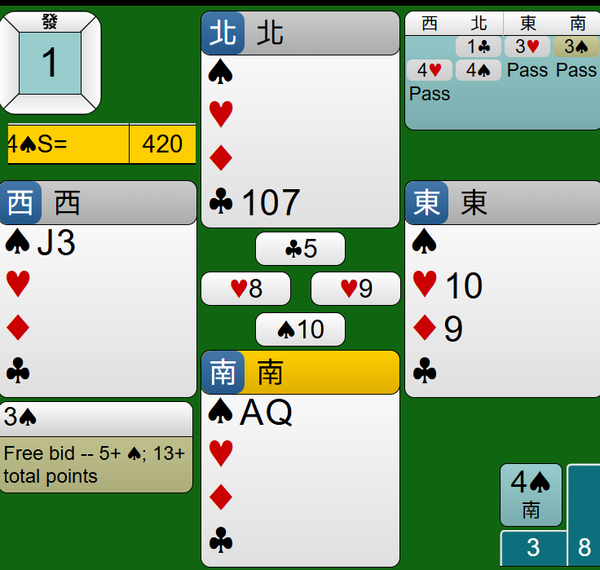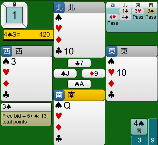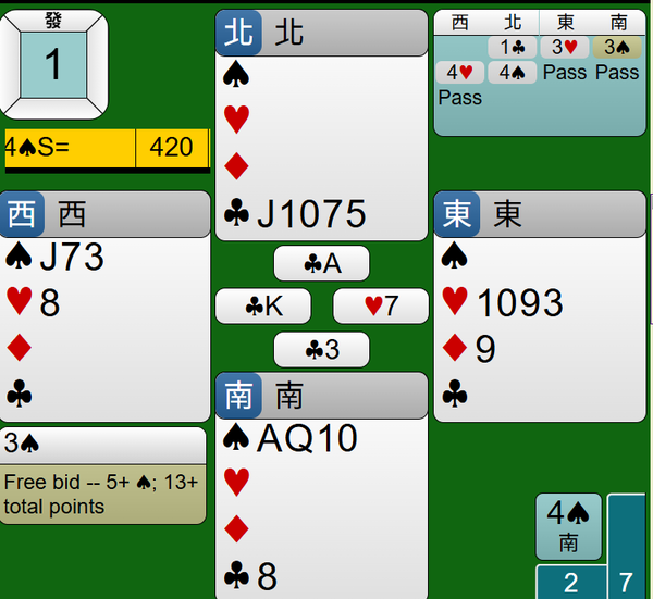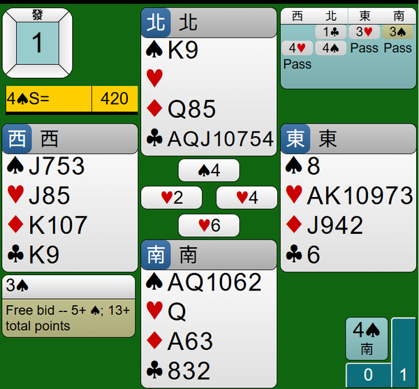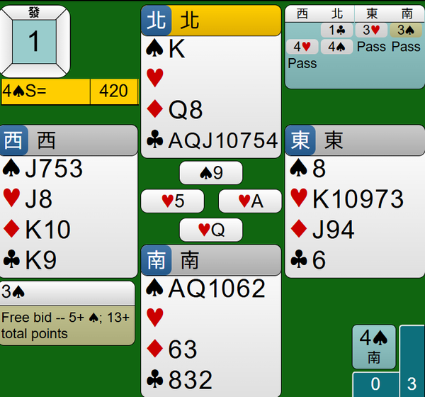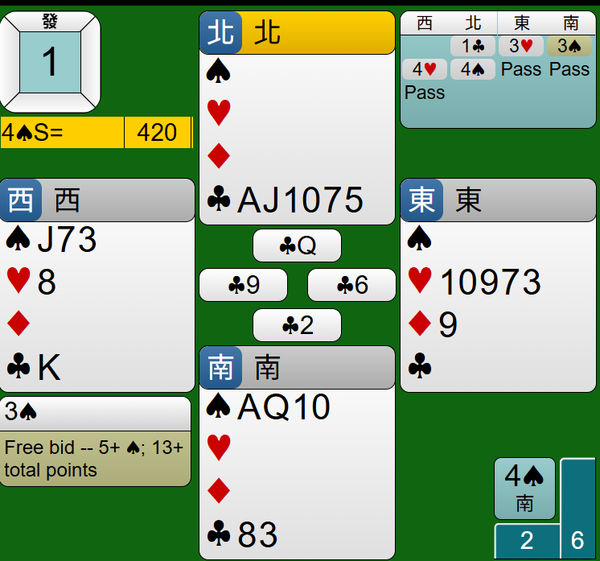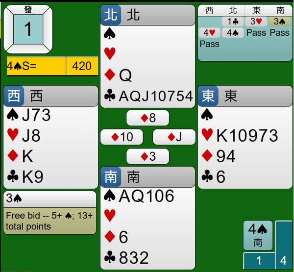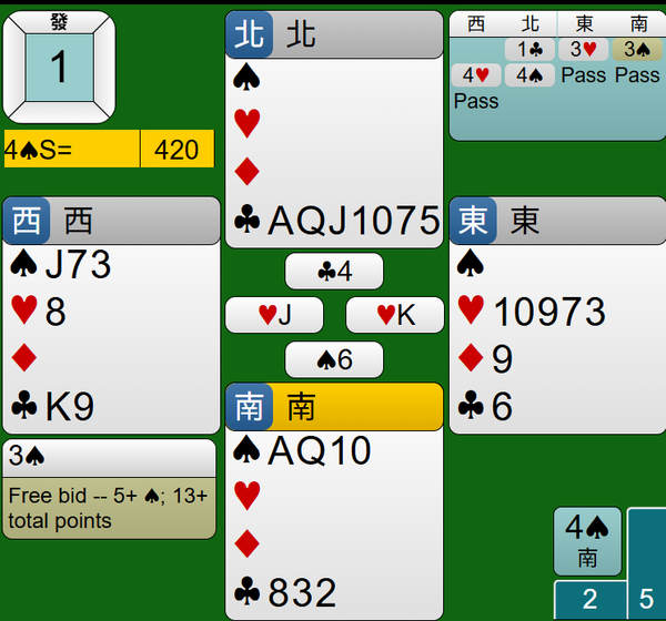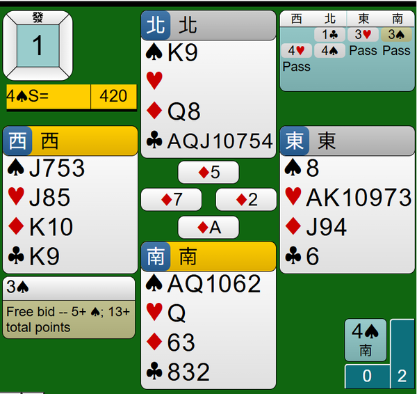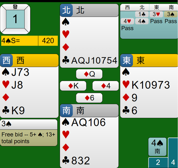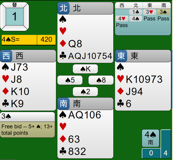 最後莊家連拔王牌黑桃AQ,4S合約如期完成,得到420分。