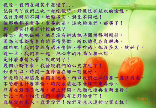 能跟家人共度晚餐時光 享天倫之樂 一樂也