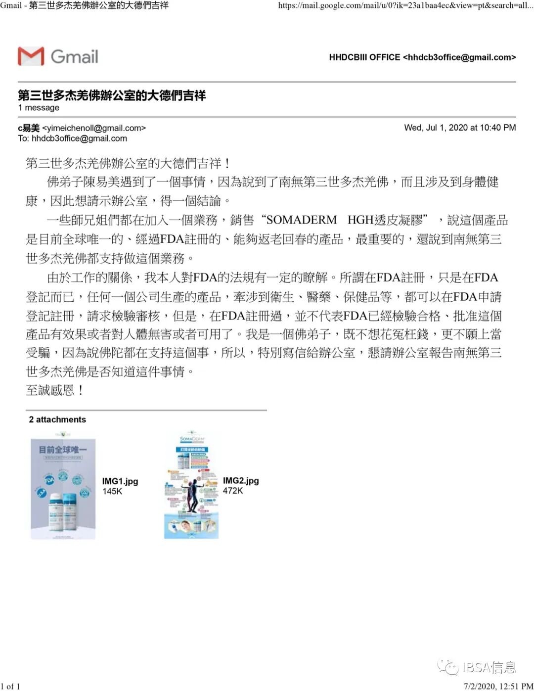 第一, 南无第三世多杰羌佛及佛陀家人昨天晚上(7月1日)看到来信咨询后,才第一次知道这个“SOMADERM HGH 透皮凝胶”产品的名称,也才知道社会上有人打着佛陀的牌子搞买卖,但至今也没有过问是哪个公司或哪些人在做这些业务。