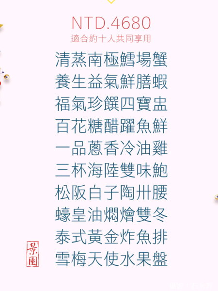母親節合菜,十道菜,特價4680。 清蒸南極鱈場蟹 養生益氣鮮膳蝦 福氣珍饌四寶盅 百花糖醋躍魚鮮 一品蔥香冷油雞 三杯海陸雙味鮑 松阪白子陶卅腰 蠔皇油燜燴雙冬 泰式黃金炸魚排 雪梅天使水果盤 活動期間:2021.04.20 - 2021.05.31 母親節合菜內用外帶皆可。 特別合菜都需至少提前兩天預定。 母親節內用桌次有限請提早預訂。 另外提供燜鴨及豬腳麵線半價加點,加點的半價燜鴨與豬腳麵線也需要事先預訂。 外帶預定有精美小禮送完為止。 #景園 #豐原美食 #母親節合菜 #合菜外帶 #週四店休 #看似簡單卻又不簡單的美味 #台灣的美味 #台灣本土豬肉使用 #台灣本土雞肉使用 很多東西是錢買不到的,忙碌的生活,百忙中抽出時間相聚,不是用來揮汗如雨做飯的,更不是烏煙瘴氣擠在廚房的,坐在冷氣房中,大夥寒暄交換關心與祝福,這才是重點,大夥交談的不外是誰家孫子多大了,誰家孫子快生了,這就是家族生命的傳承與使命。 景園海鮮餐廳母親節合菜一直供應到五月底,菜色真的是好吃又澎湃,不管是母親節也好,或是謝師宴也不錯,愛吃美食的人,可要跟上腳步了,基本上,我昨天吃完,今天就又再想有什麼名目再邀家人吃一頓了。