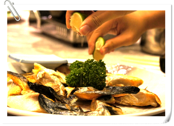 烤鮭魚下巴 帶孩子到餐廳,當然要有燒烤才能符合年輕人的口味,吃什麼最健康?對心血管最好的魚油,二話不說,來兩盤烤得酥酥脆脆的魚下巴,沒刺,不怕小小孩刺到。