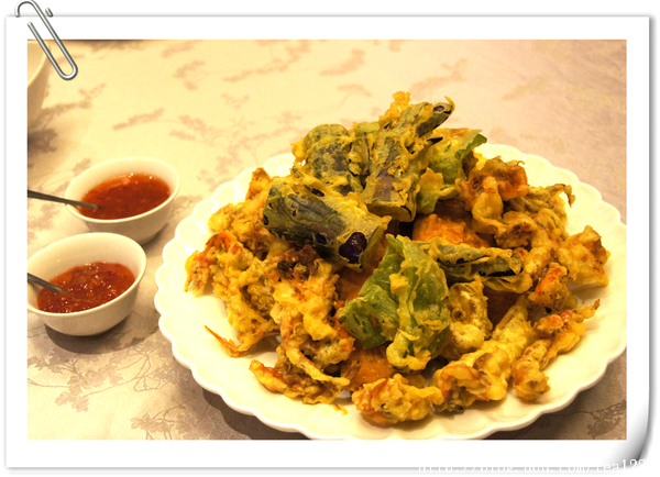 炸軟殼蟹 吃日本料理少不了炸物,軟殼蟹營養豐富,又能補鈣,老少咸宜,這像山一樣的盤中可有玄機,不但藏有茄子、地瓜、青椒…,大家自己慢慢找,因為,我只吃到這幾樣,就盤底朝天了。