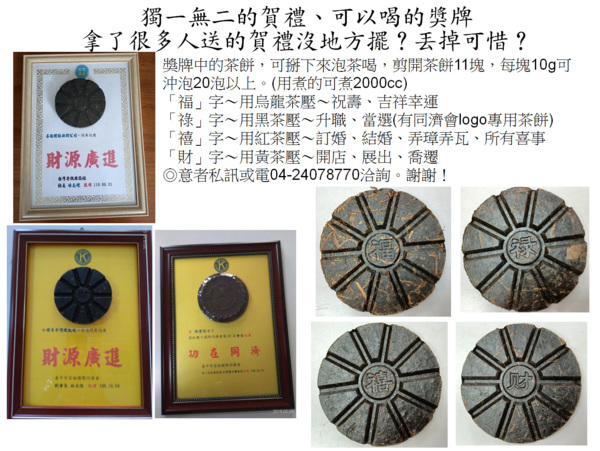 獨一無二的賀禮、可以喝的獎牌 拿了很多人送的賀禮沒地方擺?丟掉可惜? 獎牌中的茶餅,可掰下來泡茶喝,剪開茶餅11塊,每塊10g沖泡20泡以上(用煮的可煮2000cc)。 「福」字~用烏龍茶壓~祝壽、吉祥幸運 「祿」字~用黑茶壓~升職、當選 (有同濟會logo專用茶餅) 「禧」字~用紅茶壓~訂婚、結婚、弄璋弄瓦、所有喜事 「財」字~用黃茶壓~開店、展出、喬遷 ◎意者私訊或電04-24078770洽詢。謝謝!