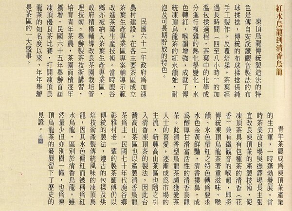 「…筆者第一次喝『凍頂烏龍茶』的印象是茶湯非常紅,像紅茶一樣,香氣低沉,滋味甘醇,喉韻特別強,感到精神清爽,特別買兩斤(每斤50元)用方紙包成四方型,其中一斤留到現在,從喝茶中體會到『凍頂烏龍茶』的魅力,…」。