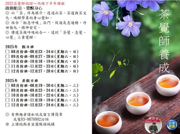 2025年 假日班 □ 08月份班~08月23、24日(星期六、日) □ 09月份班~09月27、28日(星期六、日) □ 10月份班~10月18、19日(星期六、日) □ 11月份班~11月22、23日(星期六、日) □ 12月份班~12月27、28日(星期六、日) 2025年 非假日班 □ 08月份班~08月19、20日(星期二、三) □ 09月份班~09月23、24日(星期二、三) □ 10月份班~10月21、22日(星期二、三) □ 11月份班~11月18、19日(星期二、三) □ 12月份班~12月23、24日(星期二、三) ◎ 有興趣者請私訊或留言傳簡章 或電03-9870902洽詢 ※ 上課地點在宜蘭縣頭城鎮