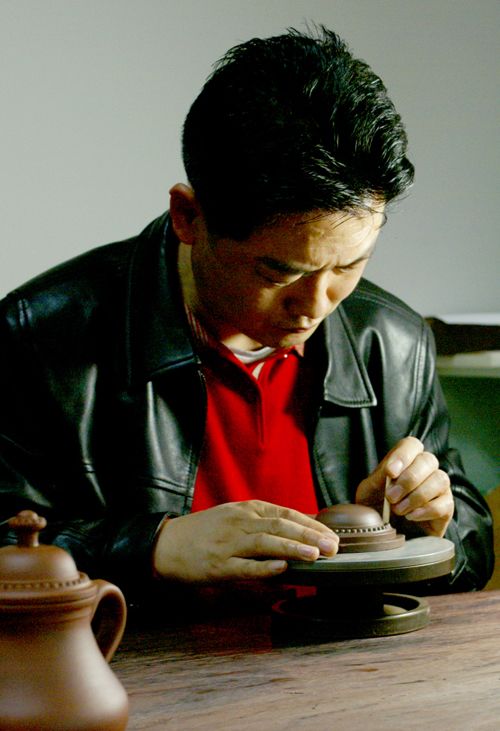 陶藝家陳岩印象 作者:談麗雲 陳岩,1965年生於宜興丁山,1981年進入紫砂工藝廠,師從中國工藝美術大師譚泉海學習雕刻。 1983年跟隨母親高級工藝美術師李碧華學習紫砂造型設計製作。 1988年到北京中央工藝美術學院深造學習。擅長在傳統基礎上充分發揮想像,構思新穎而造型別致。 一泊清水,一滴瑩珠,漾出一把茶壺;一方水土,一戶陶家,養出一位壺人。 這,便是陳岩,生長在陶都丁蜀的愛壺、制壺人。 他用獨特的眼光審視著整個陶界的古往今來,也推敲著紫砂壺的風生水起。 接觸過許多陶都宜興的陶藝家,總會聽到這樣的說法:“生在蜀山腳下,也就只想著吃泥飯了。” 這也許只是人們的笑談,但誰也無法否認,散發著陶土芬芳、滿溢著古陶風韻、充盈著紫砂氣息的丁蜀,本身就給紫砂藝術抹上了神秘的一筆,惹人歡喜,令人嚮往;更是給丁蜀人骨子裏注入了一股紫砂靈氣。 生於斯,長於斯的陳岩,還有著一位優秀的制壺工藝師母親,自然是集天時、地利、人和於一身,在紫砂的海洋裏馳騁、遨遊。 源於趣:制壺的初衷 “興趣是學習的原動力”。 早在陳岩還是學走路的年紀,就整天被在紫砂廠工作的母親帶在身邊。 那時候的陳岩,圍在母親的工作臺邊,也許還不明白母親手中的一團團泥是做什麼的,也不會明白所謂的“紫砂壺”究竟是何物,只是看著與母親並排工作的蔣蓉老師,用一方方泥雕做成活靈活現的荸薺、蓮藕器皿,看著身邊造型各異的紫砂壺,就表現出了濃厚的興趣。 用陳岩的話說:“小時候只是覺得很好玩,純粹愛好。” 所以說,陳岩對紫砂壺的喜歡是源於天性吧,是骨子裏的“紫砂血液”發揮了效用,而他對紫砂壺的瞭解和對製作紫砂的熱情則是源自於他的興趣了,就是在這種懵懵懂懂的狀態之下,有了迷迷糊糊的概念——從藝紫砂的概念。 形於母:初衷的實踐 陳岩的母親李碧華是一位高級工藝美術師,師承當代“紫砂花器巨匠”朱可心先生,是一位技藝高超而又品德優秀的陶藝家。 陳母繼承了師傅製作“花器”的特長,也練就了一手製作光素器、筋紋器的硬功夫,再加上自身對紫砂文化的領悟和發揮,不僅創作了許多精美的作品,而且培養出了蔣彥、葛陶中、李慧芳、吳鳴等等成功的徒弟們,這對於整個的宜興紫砂界都是不容忽視的貢獻。 這樣一位母親,在陳岩最初想要學習制壺的時候,就鄭重地告誡他,制壺是一項很苦、很累的工作,而且在當時,宜興的紫砂還處於比較低靡的時期,從事紫砂行業並不十分看好,陳母要陳岩做好各種心理準備,一旦決定了,就要認真對待。 母親對待紫砂藝術是一絲不苟的,自己的兒子如果要參與到其中來,也要一絲不苟。 雖然,生活中的陳母平易近人,處事謙和,但關乎工作、關乎紫砂藝術的事情,是毫不怠慢的。 所以,無論是對自己的孩子,還是對待自己的徒弟們,陳母都是嚴格要求、說一不二的。 每一個跟隨陳母學做紫砂的人進門第一件事就是學習打身筒,打泥條,陳岩自是不例外。 母親給陳岩安排的任務是一天打三十個身筒,為了讓陳岩能夠準確掌握制壺的力度、角度和運行手勢,母親幾乎是手把手地教他。 就是這樣的基本功訓練,陳岩持續了半年時間,按照母親的要求,他把每天打的最好的一個身筒留下來,齊集一個月,將三十個排成一排,一起作比較,在比較中看到自己的缺點,也感覺到自己的進步。 基本功訓練是相當枯燥乏味的,這種方式的訓練現如今已經不多見了。 一整天坐下來,手裏還在不停地揮動著木搭子,經常是累得腰酸背痛,但確實是為陳岩以後製作紫砂夯實了基礎,這讓他獲益匪淺。 經過了半年多的打片階段,終於開始學習具體製作茶壺了,想必此時的陳岩都舒了一口氣,然而,做壺也不是件輕鬆的事情。 從傳統的仿古壺,石瓢壺等等開始,練習做造型,這期間,陳岩嘗試製作的壺不計其數,卻很難有完好的成品留下來,直到84、85年左右,他的第一把成壺出爐了。 他的第一把完全手工、製作精巧、燒制成功的小仿古壺,是對他半年的基本功訓練和半年的做壺訓練的最好肯定。 這把小仿古壺,甚至被“壺藝泰斗”顧景舟先生肯定,並被顧老用作每天泡茶的器具。 這對陳岩來說,無疑是一種莫大的鼓勵,也更加堅定了他從事紫砂事業的決心。 成於己:實踐的凝煉 如果說是母親的培養和引導是把陳岩領進了紫砂藝術的大門,是扎實的基本功訓練為陳岩的紫砂之路打開了局面,那麼真正讓陳岩成為一名有為陶藝家的還是他自己的努力和對紫砂藝術的理解與發揚。 陳岩1983年開始跟隨母親學習制壺,期間師兄蔣彥還教授過他全手工仿古壺的製作,師兄吳鳴為他的壺刻字鼓勵,師兄葛陶中給他點撥手工製作的技藝,這些都是他實踐的豐富;1988年受廠裏指派赴中央工藝美術學院學習陶瓷造型設計,是他理論的充實。 北京回來後,陳岩開始自己設計製作茶壺,此時,母親已經放手讓他自己去想、去做了,只是偶爾在壺整體造型比例和形體的協調性上稍加指導。 “乘風破浪壺”,“五蝠臨盈壺”等等就是在這段時間創作的。 “乘風破浪壺”取意李太白的詩句“長風破浪會有時,直掛雲帆濟滄海”。 壺身是翻湧的浪花,壺把與壺嘴是一浪接一浪的潮水,整個水勢與浪花的走勢都顯出了風的感覺,加上壺本身暗青的色澤,仿佛是把人帶到了一片汪洋大海之上。“乘風破浪”寓意不畏艱險,戰勝困難,最終會迎來可喜的前景。 “五蝠臨盈壺”