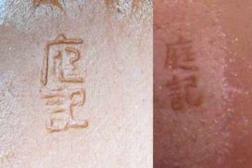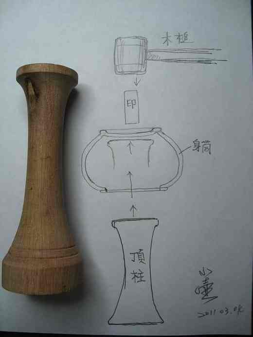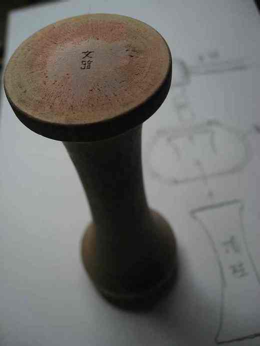 只要不是如左邊字樣的庭記.皆為仿品!! 對於落款的問題.這點不是高難度的問題. 大家都想複雜了.不用那麼多複雜想法. 也不要太過度解釋.只要照一般製程去想就可以了. 落印時需要這個工具 這個叫"頂柱" 打印時頂在壺身筒內底部. . 壺放上頂柱時 因壺內底部有點圓弧狀 所以每把壺位置不一定會都在中間點. 商品落款要求不是很高且數量一多更無法一致了. 所以才會有落款印面高低不一的情況出現. 上面文記頂柱是示範工具. 那"庭記"如何而來. 我不再多解釋. 就是如上列方法形成的!! 看圖壺友們應該就能明白了!! 這印記.是有些作者特別用來做為個人的記號 壽珍壺內的字也是用這樣的方式來的喔.... ![]() 發表於 2011-4-2 13:34 | 只看該作者
