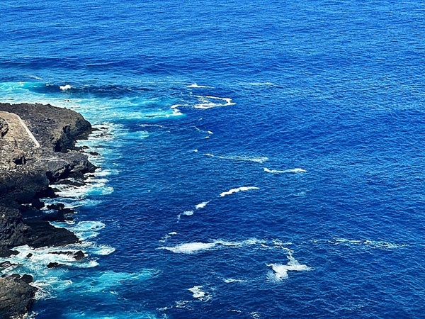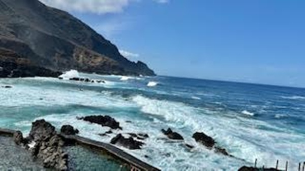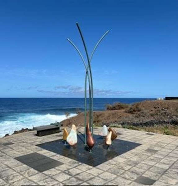驚濤裂岸 次日,我們前往拉帕爾馬島的巴洛文托(Fajana de Barlovento)海岸。那是荷西最後潛水意外去世的地方。 車子駛在蜿蜒的沿海公路上,一邊是陡峭的山壁,一邊是無垠的大西洋。抵達時陽光直射海面,把海水照得透亮。然而這份明亮掩不住岸邊那組雕塑的沉重 — 中間矗立著三根細長的鋼管,喻指三毛,周圍八塊彩石環繞,因三毛喜歡在石頭上作畫;地上方磚,用中文和西班牙文寫的是三毛的《橄欖樹》;一旁石椅上,靜靜放著複製的潛水腳蹼與泳鏡。