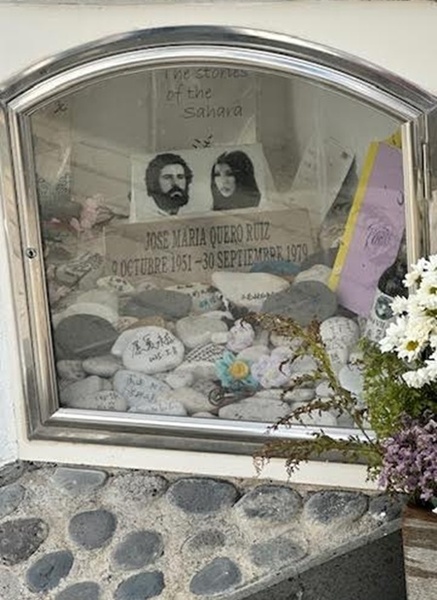 透明的玻璃壁龕中有三毛與荷西的照片,龕內滿是小石頭,上面寫著書迷的祝福與懷念。如今那龕已被鎖住,不再能放進新的石頭。那些心意,就這樣被輕輕鎖在玻璃後面,陪著荷西。