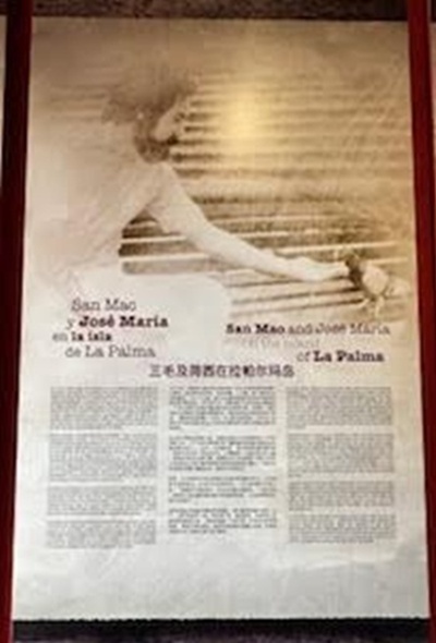 望著這組雕塑 — 鋼柱孤獨地眺望著海,深深感受著三毛永伴荷西的痴情。此刻,被無盡的潮聲包圍,心潮翻湧,這份感懷,後遂成《高陽台》一闋: 高陽台·訪荷西遇難處感懷 雲霞 礁石眠雲,潮聲說夢,滄波猶記雙星。 故壘風清,空留碧落盈盈。 當時絮語凝成卷,共天涯、鑄就深名。 轉飄零。一霎風濤,隔斷鷗盟。 青銅潛影涵冰魄,對三根鋼柱,石凳孤汀。 彩石環圍,似存手澤餘馨。 砌台極目心潮湧,立蒼溟、幽愫誰聆? 到而今,萬籟如經,盡誦痴情。 聚焦照片的凝望 在拉帕爾馬島市中心的博物館,有個專紀念三毛的展廳。穿過種滿樹的庭院,看見一間沒有門扉的房間,三面是牆,餘一面全然開放,彷彿歡迎所有人自由進出。正中的牆上掛著三毛的巨幅頭像。黑白照片中的她眼神清澈,靜靜地凝望著每一個到訪者,展櫃裡放的是她最愛的鵝卵石,上面畫著幾棵橄欖樹。旁邊的牆上,用中文、英文和西語寫著她的故事。