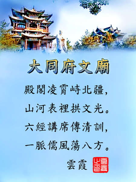 (一)七絕 大同府文廟 雲霞 殿閣凌霄峙北疆,山河表裡拱文光。 六經講席傳清訓,一脈儒風蕩八方。