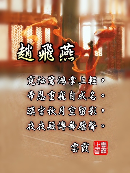 趙飛燕 雲霞 霓袖驚鴻掌上輕,帝恩重寵自成名。 漢宮秋月空留影,夜夜疑傳舞屧聲。