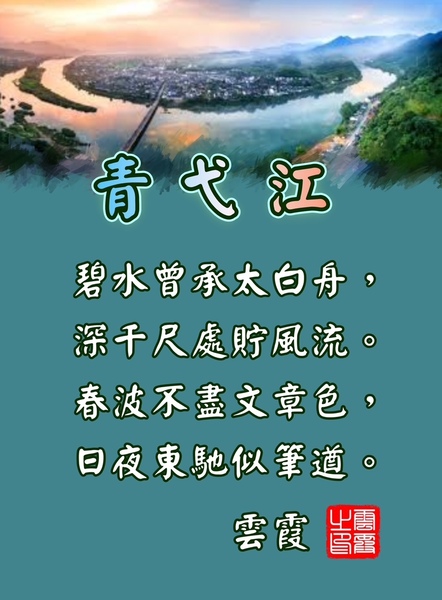 青弋江 雲霞 碧水曾承太白舟,深千尺處貯風流。 春波不盡文章色,日夜東馳似筆遒。