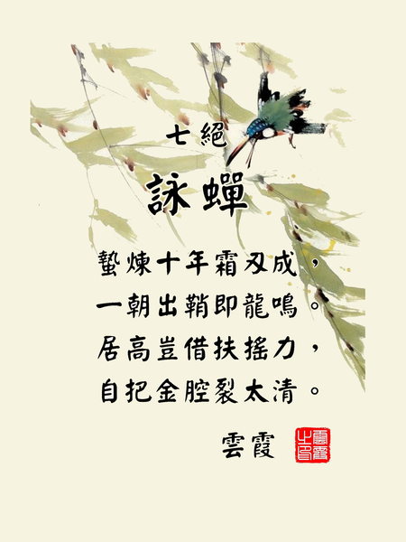 詠蟬 雲霞 蟄煉十年霜刃成,一朝出鞘即龍鳴。 居高豈借扶搖力,自把金腔裂太清。