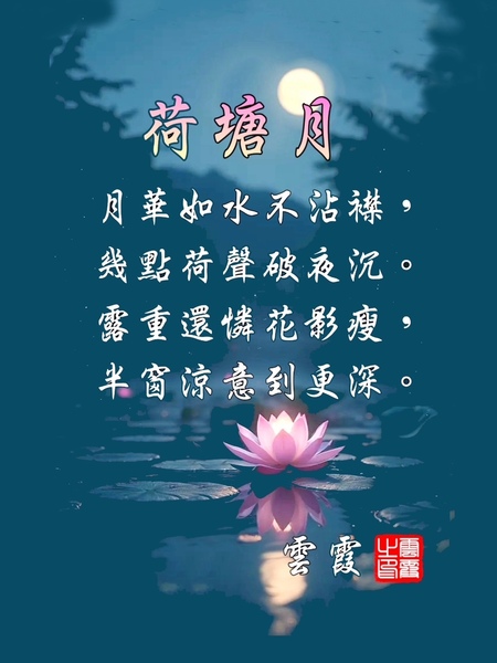 荷塘月 雲霞 月華如水不沾襟,幾點荷聲破夜沉。 露重還憐花影瘦,半窗涼意到更深。