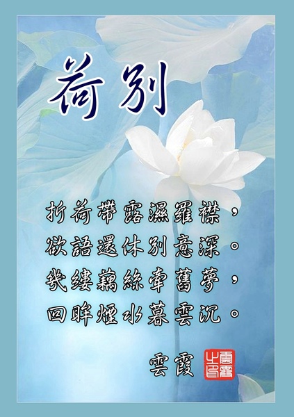 荷別 雲霞 折荷帶露濕羅襟,欲語還休別意深。 幾縷藕絲牽舊夢,回眸煙水暮雲沉。