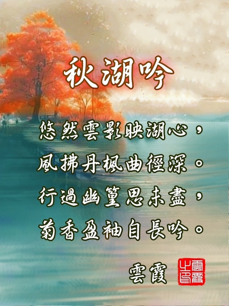 秋湖吟 雲霞 悠然雲影映湖心,風拂丹楓曲徑深。 行過幽篁思未盡,菊香盈袖自長吟。