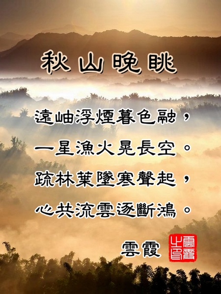 秋山晚眺 雲霞 遠岫浮煙暮色融,一星漁火晃長空。 疏林葉墜寒聲起,心共流雲逐斷鴻。