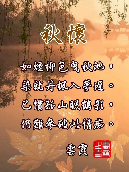 秋懷 雲霞 如煙柳色曳秋池,染就丹楓入夢遲。 已慣孤山眠鶴影,仍難參破此情痴。