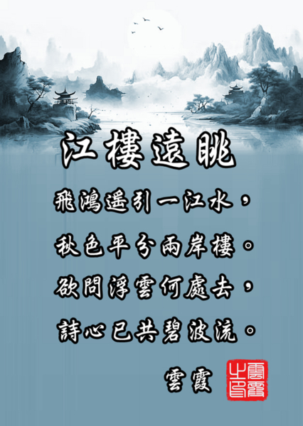江樓遠眺 (嵌句“飛鴻遙引一江水”) 雲霞 飛鴻遙引一江水,秋色平分兩岸樓。 欲問浮雲何處去,詩心已共碧波流。