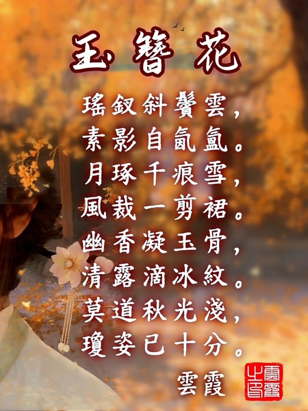 (二) 五律/七律 玉簪花 雲霞 瑤釵斜鬢雲,素影自氤氳。 月琢千痕雪,風裁一剪裙。 幽香凝玉骨,清露滴冰紋。 莫道秋光淺,瓊姿已十分。