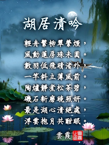 湖居清吟 雲霞 輕舟繫柳翠縈煙,風動蓮房珠未圓。 數羽低飛晴渚外,一竿斜立薄風前。 陶爐靜煮松茶碧,磯石新磨晚照妍。 最是湖心清絕處,浮雲抱月共酣眠。