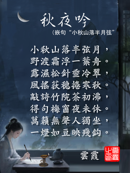 秋夜吟(嵌句“小秋山落半月弦”) 雲霞 小秋山落半弦月,野渡霜浮一葉舟。 露濕松針垂冷翠,風搖荻穗捲寒秋。 敲詩竹院茶初沸,得句梅窗夜未休。 萬籟無聲人獨坐,一燈如豆映殘鈎。