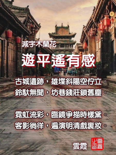 (三)詞曲 減字木蘭花·遊平遙有感 雲霞 古城遺跡,雄堞斜陽空佇立。 鈴馱無聞,坊巷錢莊鎖舊塵。 霓虹流彩,臨鏡爭描時樣黛。 客影徜徉,遍演明清戲裏妝。