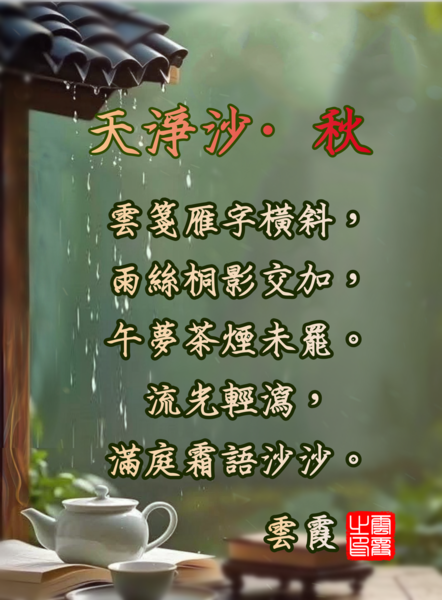 天淨沙·秋 雲霞 雲箋雁字橫斜,雨絲桐影交加,午夢茶煙未罷。流光輕瀉,滿庭霜語沙沙。