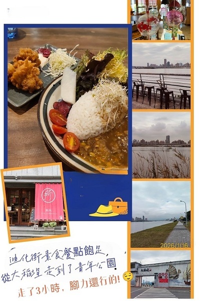 2026/1/16 迪化街一家 無所洋食 的素食餐廳, 吃完 附近是大稻埕 ~ 沿著河岸腳踏車道走, 3小時是極限了, 要找出口離開. 青年公園 是最近的. 這樣的活動力, 晚上好睡.
