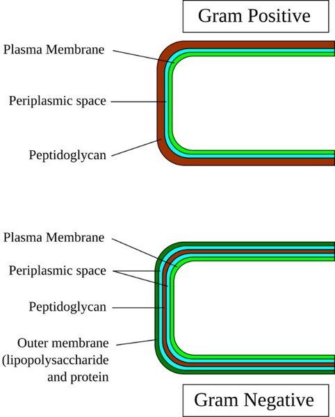 圖1-1革蘭氏陽性菌(Gram Positive)與格蘭氏陰性菌(Gram negative)細胞壁染色之比較(註5)。革蘭氏染色法可以造成陽性菌與陰性菌之間的區隔。染色的原因是由於它們細胞壁中含有的肽聚糖與染劑中的碘和結晶紫結合後又和菌體內核糖核酸鎂鹽-蛋白質複合物結合,所產生的複合物結合比較牢固,不容易被之後的酒精脫色。革蘭氏陽性菌是因最外側的表層為較厚較大量的肽聚糖,因而能夠用革蘭氏染色法染成深藍或紫色的細菌,而革蘭氏陰性菌不能被染色。但因革蘭氏陰性菌擁有的第二層外膜的脂多糖層,所以革蘭氏陰性菌染色不牢固,紫色容易脫色,通常複染則成為紅色以作為對比。陰性菌細胞膜與外膜中間含有少許肽聚醣,與真核細胞的細胞核的結構有很大的出入。圖片來源:維基百科關鍵字『革蘭氏陽性菌』,CC BY-SA 3.0 File:Gram-Cell-wall.svg 然而在解釋真核生物如何演化出『細胞核』呢?進化論者主流雖然也用『內共生假說』加以解釋細胞核的來源,卻產生矛盾與不合理,證據不足,只有推想的情形!目前由於缺乏中間型化石的直接證據,科學界對於『細胞核是怎麼來的』,仍沒有定論,除了內共生假說之外,其他還有自發生假說 (Autogenous Hypothesis)、病毒真核發生假說 (Viral Eukaryogenesis)、內向外假說 (Inside-Out Hypothesis),呈現演化學者眾說紛紜、莫衷一是的情況!(註6)這說出演化學者其實也是在一種的懸疑不確定的狀況!若是古生物真正有確定的演化軌跡與事實,演化學說的發展其實不該是呈現此種紊亂的情況的!進化論主流的『內共生假說』假設如下:太古古菌在『一次偶然的機會』先內共生內吞了異營好氧細菌(進化論者目前主張是一種海洋中的α–變形菌)因而形成了粒線體,使其神奇地獲得氧化有機養分的能力;之後再一次內共生內吞藍綠菌之後成為葉綠體,之後形成了後來的藻類或植物界。被內吞的格蘭氏陰性菌的DNA是被兩層膜包裹,內吞陷入原始古菌。之後又剛好內吞了細胞膜使其形成了這個新生古菌的『細胞核』。也就是一個大型的宿主細胞(通常被認為可能是阿思嘉德古菌)分別依序吞噬了另兩個較小的α–變形菌與藍綠菌,但沒有將其消化,而是形成了粒線體與葉綠體的共生關係。然而這樣的說法的問題很大:
