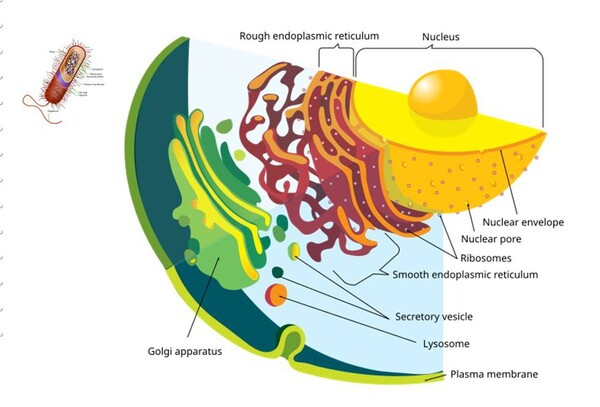 圖1-2真核生物的細胞具有極多細胞內的膜狀胞器(包含圖中的粗糙內質網、平滑內質網、高基氏體、分泌囊泡與溶體)連結細胞核。所有動物、植物、真菌、海藻和許多單細胞生物(如變形蟲、草履蟲)都是真核生物,兩大類原核生物(即細菌和古菌)的細胞複雜度與真核生物的細胞有天壤之別,體積大小更相差接近10,000倍,形成各類生物廣進化歷程(如果有的話)中的一大難題。圖上大腸桿菌的比例大小符合與真核細胞實際的比例。試問兩者構造的複雜度差異大到無法想像;體積之大小差異竟然將近10,000倍,兩者之間又極度缺乏轉變的中間型化石紀錄,真核生物可能由原核生物演化而來嗎?僅僅種系發生學的DNA比對相似度又代表甚麼呢?圖片來源:維基百科關鍵字:內膜系統;公有領域圖片。