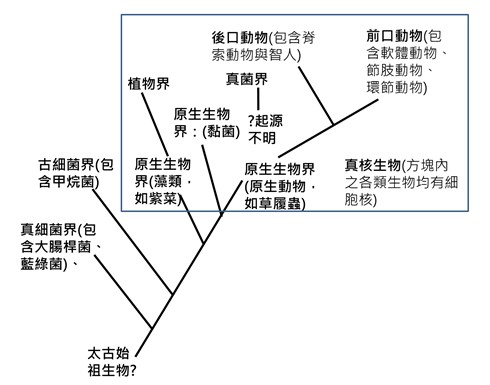 『太古細菌』(原核生物祖先)無細胞核,應當較接近於於現生的真細菌(如大腸桿菌、金黃色葡萄球菌等) 或古細菌(如嗜熱溫泉菌、甲烷菌等),而『太古變形蟲』(真核生物祖先)有細胞核,相當於現生的有核單細胞之原生動物(如變形蟲),之後還要演化出『多細胞植物』與『多細胞動物』這些極複雜的真核生物生命形式。以細胞結構的複雜性而言,依進化推想必然是由原核生物的細胞演化為真核細胞,較為符合由簡趨繁的進化原則。然而以細胞結構而言,其實原核細菌與真核生物這兩類細胞結構與生理功能不只差異甚大,複雜程度更是一下子三級跳,在演化上有許多難以解釋的大跳躍,而這根本就不是達爾文所主張的微小變異累積的『漸進改變』。常見細菌長度約 0.5至 10微米(𝜇𝑚),而大變形蟲在運動時長度約 220至 749微米,光長度相差可達數十倍。而一個真核細胞光體積就是原核生物細胞的1,000~10,000倍(如人類的骨骼肌細胞)左右;複雜度與運作機制更是較原核生物複雜千百倍。精通動物學與微生物學得的美國榮譽博士蕭文(Frank Sherwin)指出原核生物與真核生物這兩者的鴻溝其實是非常大且難以輕易跨越的(註11;見附圖1-2): 『真核生物是含有多種分化細胞類型的多細胞生物。幾乎每個細胞內都有稱為胞器的亞細胞區室來管理特定功能。最重要的膜狀胞器包括細胞核、粒線體和葉綠體(註:其他還有過氧化體、高基氏體與溶體),它們各自被包裹在獨特的磷脂質雙層(雙層膜)內。這些膜結合細胞器非常複雜,並提供對生命至關重要的獨特資源。依進化論的假設,人類、植物、真菌和動物最初都是由真核細胞組成的。 演化論中最具爭議的問題之一是:人們認為是由自由生活的單細胞原核生物(細菌和古菌)成為單細胞和多細胞真核生物的主要胞器。換句話說,在漫長而不可觀測的時間內,單細胞生物竟轉變成如今遍布地球的、極其複雜的多細胞生物內的膜狀胞器。進化論者提議的機制是什麼?進化論者的答案是「內共生」。』 所謂『內共生』,也就是A生物細胞被B生物細胞內吞而變成的B細胞的一部分構造。但試問兩種差異甚大的生命體憑甚麼可以毫無理由地說合併就合併成一個生命體,而彼此的基因與生命表現難道不會『互相排斥』嗎?各種生命的細胞生理表現難道沒有其自身的『主體性』嗎?兩種不同類的生命體其細胞生理運作生命特性彼此相異,正常情況彼此必然是相互排斥及牴觸的。試想我們人類的體內的白血球容得下細菌與病毒進入人體嗎?這不只嚴重違背遺傳學原理,以現行的生物看來被內吞的生物體通常都會受到宿主的免疫攻擊。內共生假說主張:A細胞吞了B細胞之後竟然形成了同一個生命體!聽起來就如同科幻小說一般魔幻!儘管進化論者一直用『種系發生學』的DNA分子的核苷酸含氮鹼基序列相似性去提供原核生物(如細菌)演化成真核生物(如變形蟲)過程的合理性,但是任何人都必須承認的是:原核生物(真細菌或古細菌的共同祖先)的細胞若真能演化為真核細胞(原生生物界),其過程(見圖1-3)有極多重大的障礙必須跨越!這些重大的障礙不是僅僅進化論的核心概念:『先產生基因重組(含突變)加上後天環境的天擇』可以輕易解釋的。正如英國生物化學博士尼克.連恩(Nick Lane;他是進化論者)在他的著作所說的,真核細胞共同祖先的演化軌跡的追溯如同『進入黑洞』一樣找不到頭緒(註12):