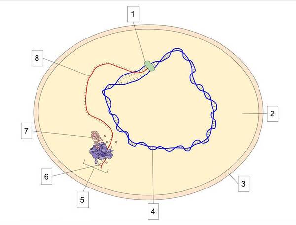 圖1-4原核生物與真核生物基因表現大不同。原核生物(如細菌)基因表現(註13)是藉著從DNA轉錄為mRNA後直接在核糖體上進行轉譯。與真核生物不同的是原核生物沒有細胞核,這使得核糖體可以直接連接到mRNA的一端直接轉譯,而另一端可繼續同步轉錄。亦即原核生物的轉錄與轉譯是可以同步進行的,但若演化為真核生物的話就只能先在細胞核內只進行訊息RNA(mRNA)的轉錄,同時要進行DNA插入多段內含子並初始RNA剪接的細胞演化(這還需要演化出小核核糖核蛋白【snRNP】的剪接體修剪初始RNA)。而蛋白質轉譯要等到初始訊息RNA剪接為成熟RNA且移出核外到細胞質才能進行。如此大的差別,原核生物要如何大跳躍演化為真核生物的基因表現機制呢?進化論者不用思考這樣的機制如何大跳躍演化出來嗎?右圖例:1 - RNA聚合酶,2 -細胞質,3 -細胞膜,4 - DNA,5 - 核醣體,6 -胺基酸,7 -多肽鏈,8 – mRNA。圖片來源:左圖→維基百科:染色體&核小體。右圖→維基百科:Bacterial transcription公共領域。 4.遺傳單位由多順反子轉為單順反子:以遺傳的功能表達的最小單位(順反子:Cistron)而言,在早期細菌遺傳學中,順反子表示結構基因轉錄單位,即編碼蛋白質多肽鏈的基因。原核生物的順反子結構為『多順反子』;而真核生物的順反子結構為『單順反子』(註15)。一般原核生物『多順反子』進行RNA轉錄的時候,是一口氣可以表達多個基因產物(註:連續產生作用彼此相關的多個蛋白質,也就是『一口氣做好幾個蛋白質』);而真核生物以『單順反子』的形式進行RNA轉錄的時候,卻只能表達一個基因產物(註:只能產生一個蛋白質)。若原核生物真的能演化為真核生物,如此其每個基因的表達方式全部要『打掉重練』!兩者根本就是有天壤之別!這樣原核生物若進化為真核生物,兩者基因表達如此巨大的分子生物學的演化障礙是如何得以跨越的?進化論者有想過嗎?而原核生物多個『作用相關』的順反子的位置竟然可以原本就連在一起一口氣被轉錄,要做就一起被製作,而不是一個一個獨立的被製作,這也未免太巧了!簡直就像是預先設計好的!