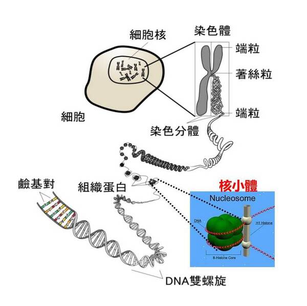 圖1-3目前(2025年)進化論者主流認定六界分類系統中,原核生物(真細菌界、古細菌界)與真核生物四個界(原生生物界、真菌界、植物界、動物界)之相互演化關係。目前真菌界的演化起源呈現其生理特徵與其分子生物學相似性兩者產生矛盾彼此牴觸的情形,演化學者無法有一致的共識。根據分子生物學的DNA定序結果,真菌界與黏菌卻有極大的不同,因此呈現真菌界祖先目前仍尚待研究、無法認定的情形(參見維基百科關鍵字:真菌)。而粘菌為何與真菌生理結構相似?進化論一貫的解釋就是因環境相似因而產生了所謂的『趨同演化』。但試問:若萬物真有以上廣進化之跨界演化關係,為何真菌界與黏菌分子生物學DNA定序與生理特徵之相似性彼此竟產生嚴重矛盾不一致的結果呢? 2.根本改變遺傳物質的結構:真核生物的遺傳物質DNA與蛋白質緊密結合,在細胞周期的生長期(間期)形成線狀的染色質,並以棒狀染色體形式存在於細胞核內,其數目隨物種的不同而不同(如野生小麥14條、人類46條、非洲眼鏡猴80條)。真核生物其染色質之DNA纏繞8顆組織蛋白而形成核小體的結構(註13;圖1-4),能在有絲分裂時精密摺疊形成『短棒狀染色體』。而原核生物的DNA則以『環狀折疊』的形式存在於細胞質的擬核區中,完全沒有核膜的包圍。而原核生物(細菌)的DNA以環狀結構來回包裹捆綁的DNA稱為擬核。它將DNA集中在細胞的某個區域,但不像 真核生物那樣被核膜隔開。 DNA會形成環狀結構而非真核生物的線狀,並連接到附著在細胞壁上的蛋白質核心(見圖1-4)。這兩者的結構差這麼多!在物種的演化上要怎麼由簡趨繁而加以跨越呢? 3. RNA轉錄和蛋白質轉譯的分離:在原核生物中,轉錄和轉譯是同時在細胞質進行的(註14)。而在真核生物中,基因轉錄(將DNA基因的遺傳密碼抄錄於RNA的過程)在細胞核內進行,而RNA必須穿過雙層貘細胞核的核孔,將遺傳密碼帶出而轉譯為蛋白質在細胞質中進行。此一差別也是徹頭徹尾的不同!而少有進化理論去探索原核生物演化為真核生物的過程為何會在演化過程中一下子能『進化撐竿跳』?——從原核細胞的『轉錄和轉譯是同時進行』一下子產生雙層膜的核膜,演化大跳躍到真核細胞的『先轉錄,穿核孔,後轉譯』?如此大的差別,原核生物要如何大跳躍演化為真核生物的基因表現機制呢?進化論者難道不用思考這樣的機制如何大跳躍演化出來嗎?