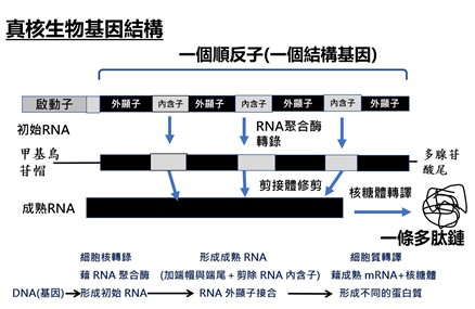 圖1-5 多順反子見於原核生物(但原核生物也有單順反子作用單位),意指一個轉錄單位轉錄出來的一個mRNA分子編碼可多個多肽鏈。這些多肽鏈對應的DNA片段則位於同一轉錄單位內,享有同一對起點和終點。而單順反子則見於真核生物,其所轉錄的初始RNA在細胞核經過剪接體修剪去除內含子之後,形成『成熟RNA』。一個轉錄完畢的成熟mRNA內含有外顯子對應的蛋白質轉錄產物,而該成熟mRNA只編碼一條多肽鏈。多順反子與單順反子這是完全兩種截然不同的轉錄基因結構,要如何相互演化轉變呢?