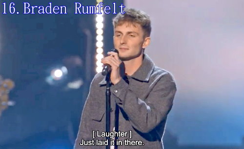 16. Braden Rumfelt - I’m Not the Only One,他一開口,就帶著深情,聲音有穿透力,他唱得全場沸騰。*** 進入前20