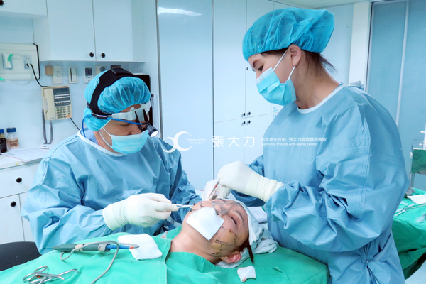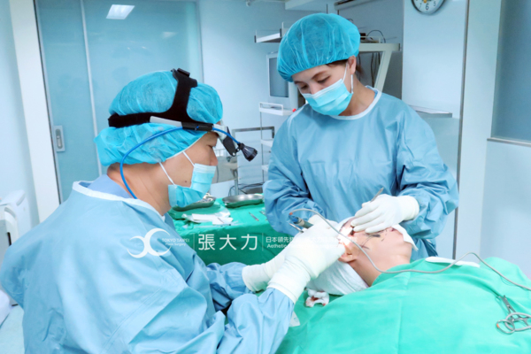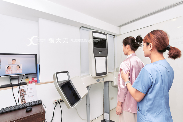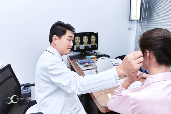 整形外科張大力院長在岳庭的臉上勾勒拉提的點,並諮詢雙眼皮的深度與寬度。